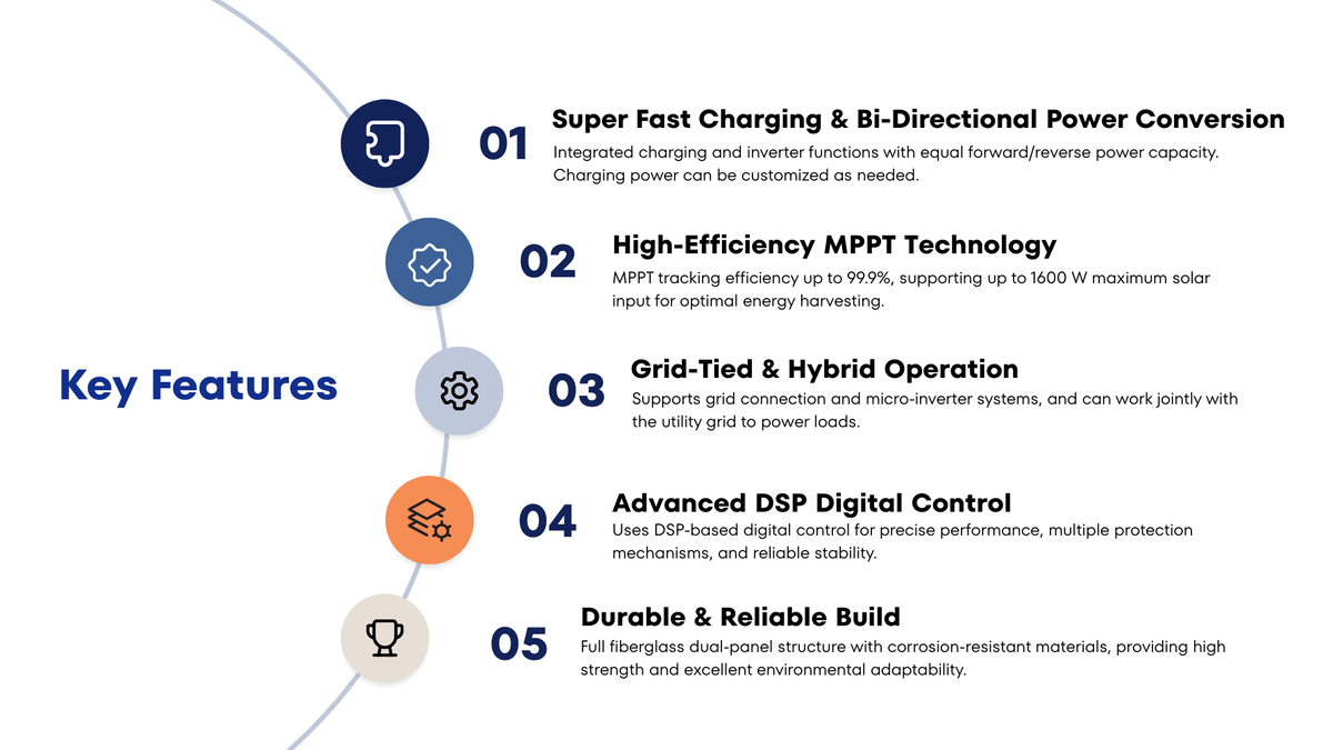 Designed with user safety in mind, the inverter features built-in leakage protection and advanced DSP control technology, ensuring stability and reliability in operation. The high charge/discharge efficiency minimizes energy loss and heat generation, extending battery life and maximizing discharge time. Furthermore, its compact design and durable construction, crafted with dual-sided fiberglass panels, make it lightweight and resistant to corrosion, ideal for both portable and mobile applications.