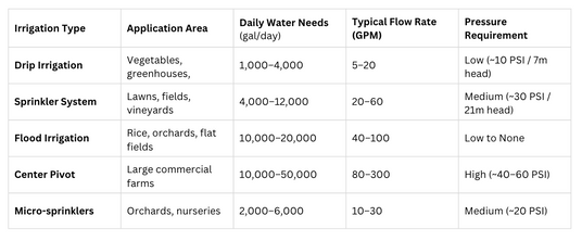 Identify how you’re applying water: drip, sprinkler, flood, or other. Each method has different flow and pressure needs.